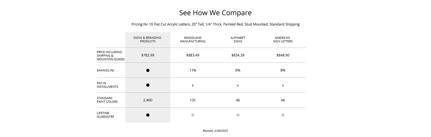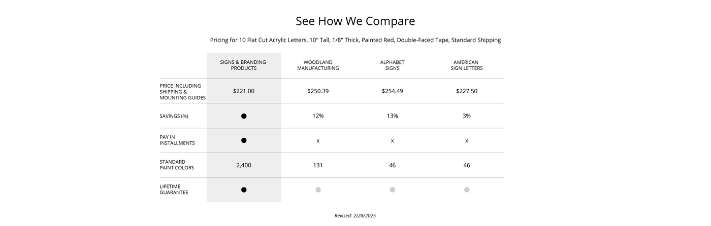 Available in any of the 2,300+ Pantone (PMS) paint colors, these acrylic sign letters and numbers are versatile and affordable. Suitable for almost any application, indoor or out - from exterior storefront and monument signs, to interior lobby and wayfinding signs, and just about anything in-between.